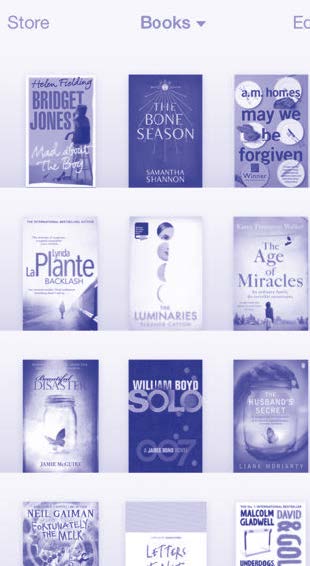 Captures d’écran de l’application iPhone iBooks v. 3.2. Les étagères en bois de l’ancienne version d’iBooks ont été remplacées par des dégradés. L’animation de changement de page est toujours présente. Ce « redesign » conserve donc, sous forme fantôme, les métaphores de la bibliothèque. Système d’exploitation ios 7, novembre 2013. Résolution d’écran de l’iPhone 5 : 1136 x 640 px, 326 ppp.